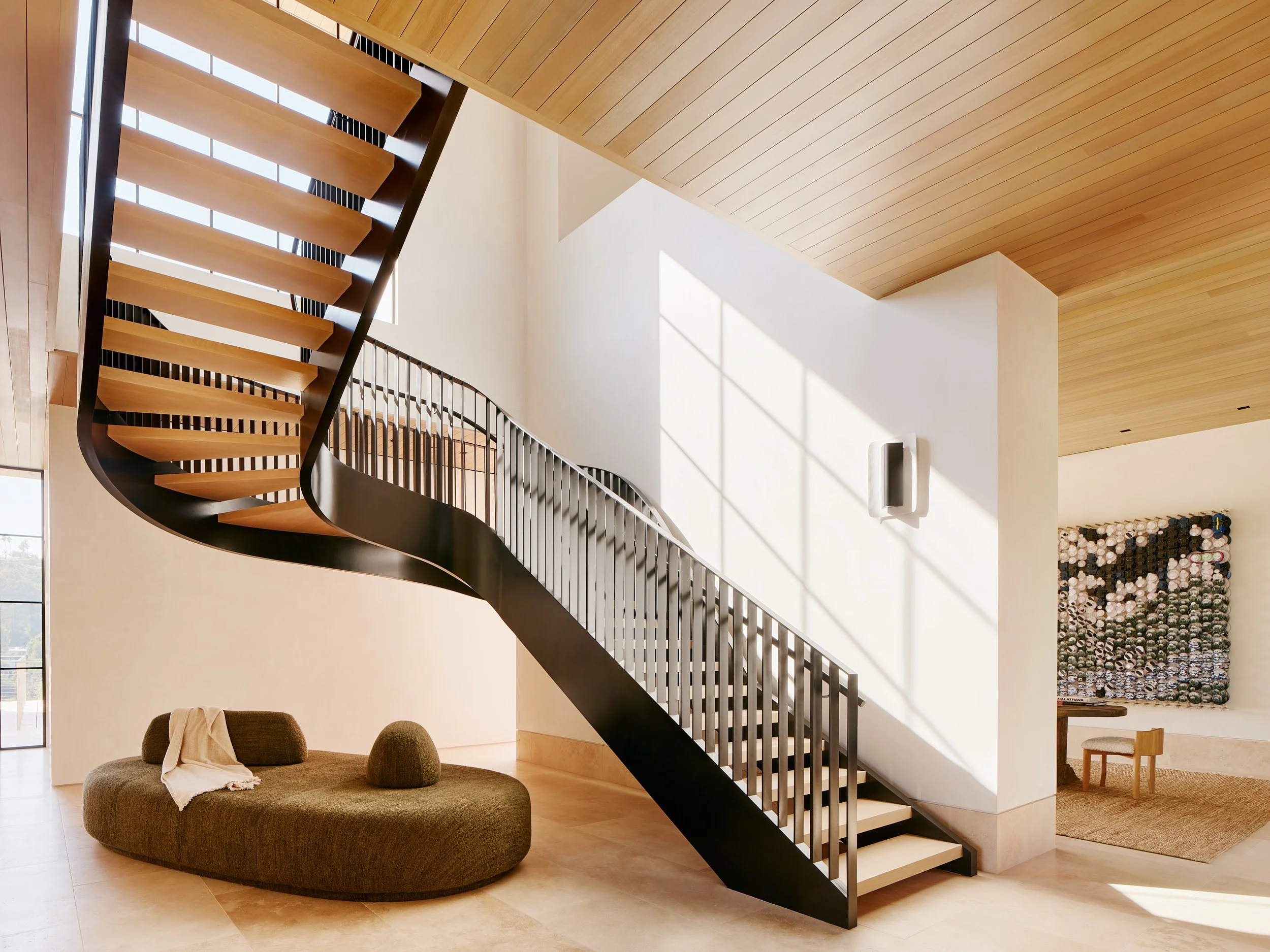 The sinuous forms of the steel feature stair are meant to be a departure from the heavier and more rectangular nature of the house. The curves are further accentuated by expressing, then interpolating back to nothing, the typical code requirements for railings and guards.