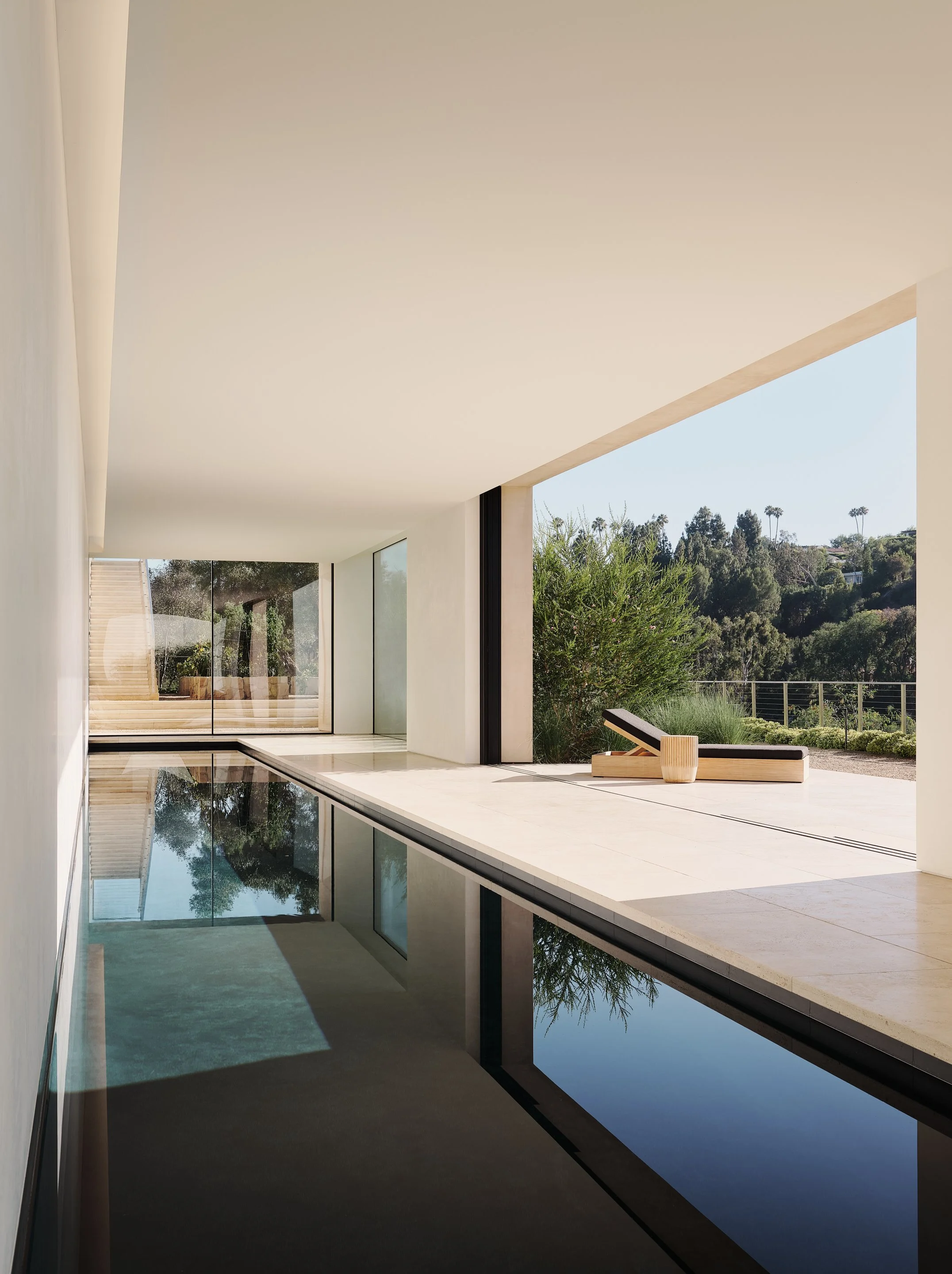 A minimally furnished, centrally located loggia was intentionally placed to create a framed view of the Santa Monica beaches to the south of the home. There are two flanking stone walls on both sides of the room for art and the two glass walls aligned with the view pocket fully into the adjacent walls. The result is a space in which the boundary between interior and exterior can be fully erased and the home can be integrated into its natural surroundings, this includes the over twenty-five thousand square feet, mostly flat, yard to the south. At the lowest level, there is an indoor lap pool, gym, guestrooms, and caretaker’s suite, all with views out to Mandeville canyon below.
