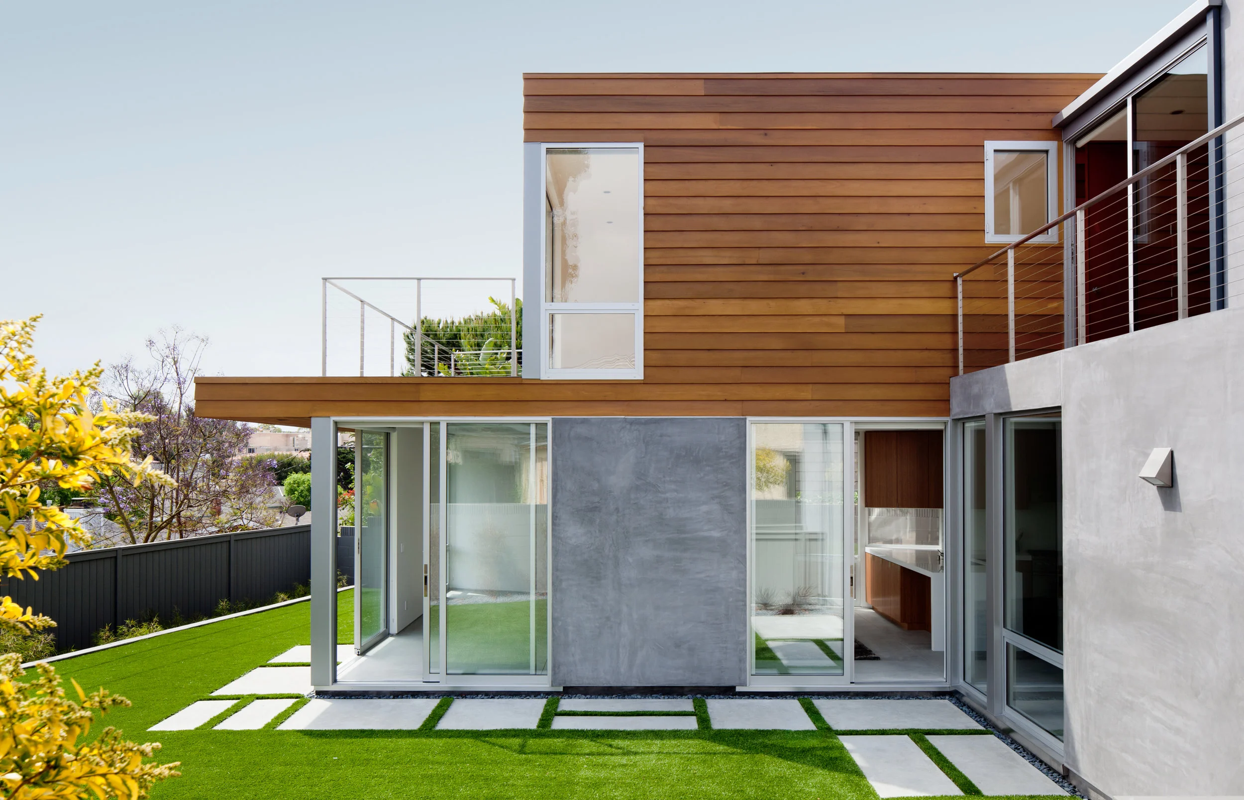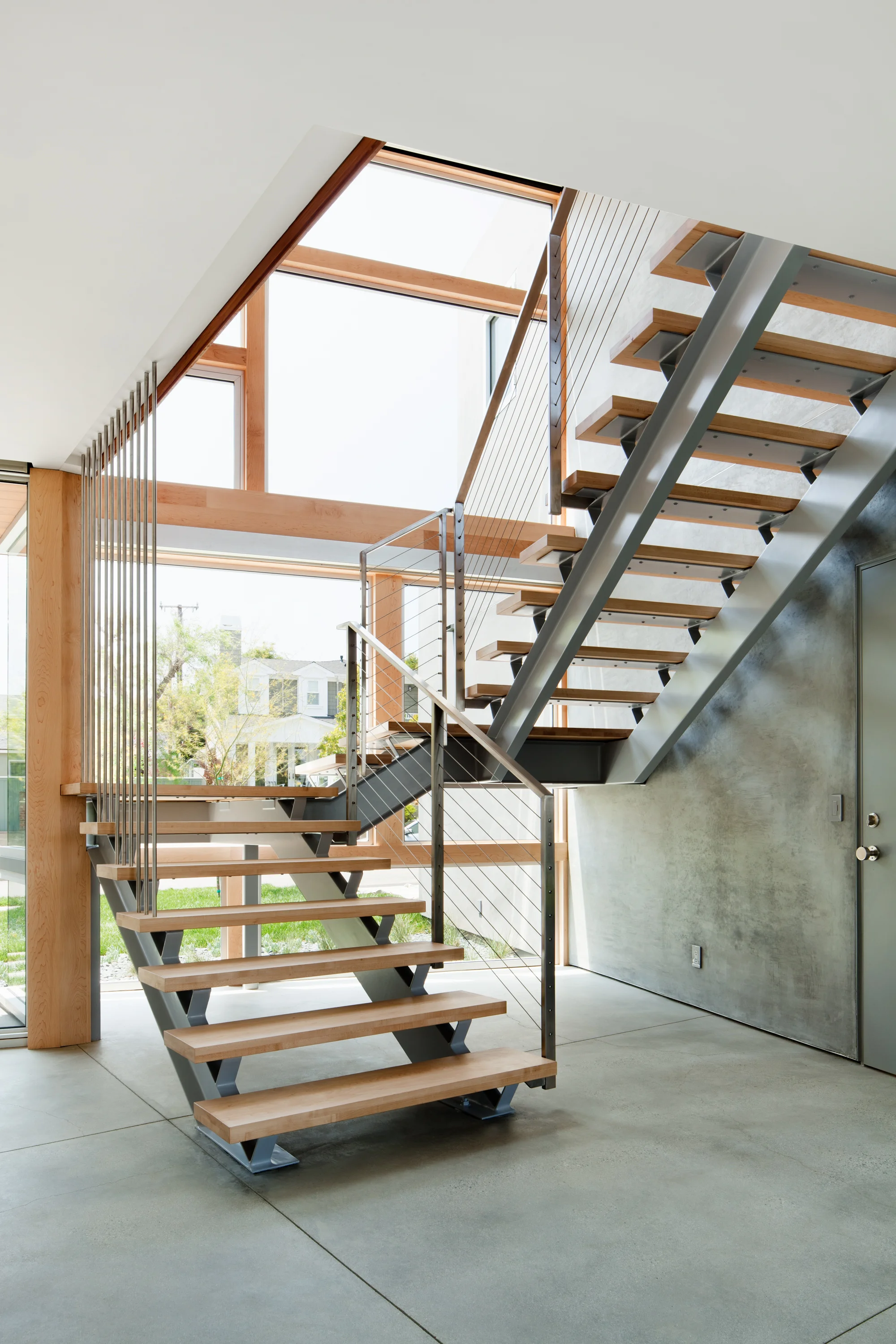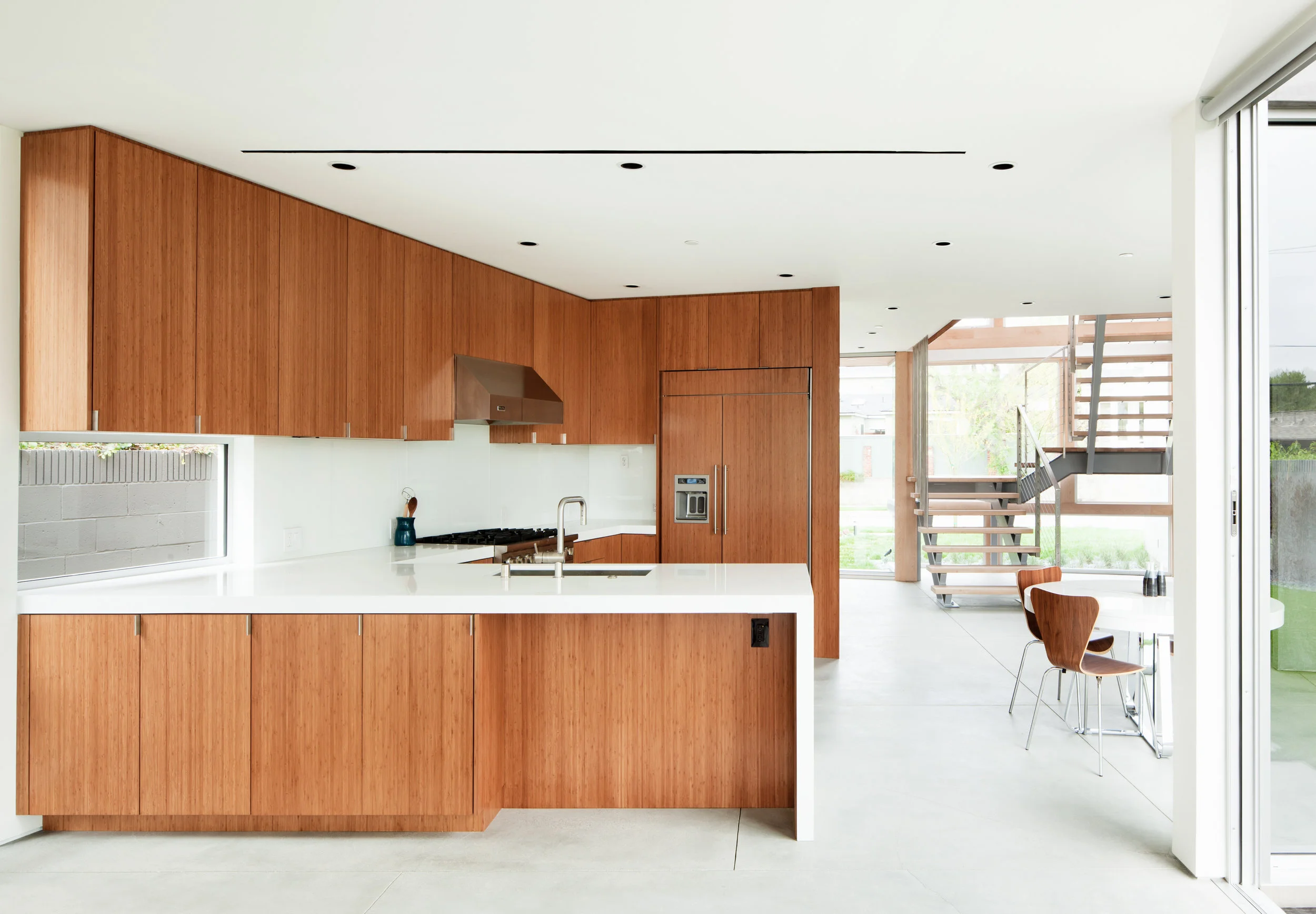 This new construction, approximately 2,500 s.f. home is placed on a tight infill Manhattan Beach lot. The placement and massing of the house is a response to local zoning codes and internal programmatic needs. We rotated the south wing of the house sixteen degrees towards the San Gabriel Mountains and Downtown LA. This also helped the internal and external spaces feel more dynamic. Exterior cement plaster and cedar siding were carried inside to the central stair and circulation space. This was Walker Workshop's first entirely ground-up new construction project and we delivered the project on time and on budget.