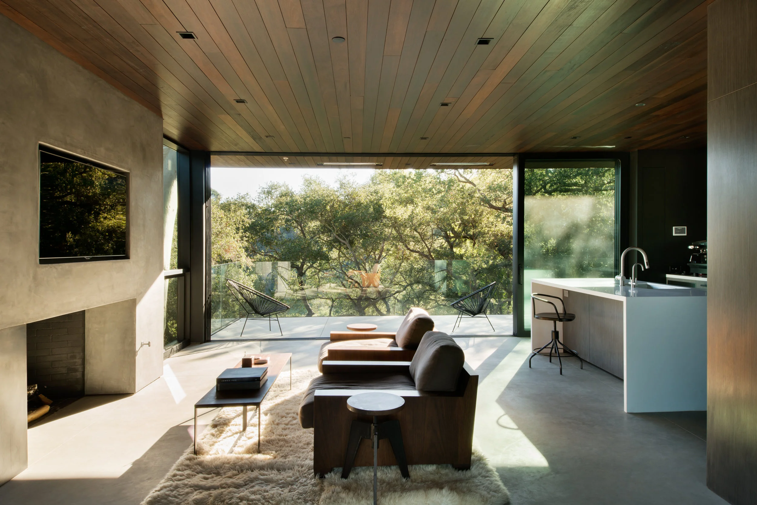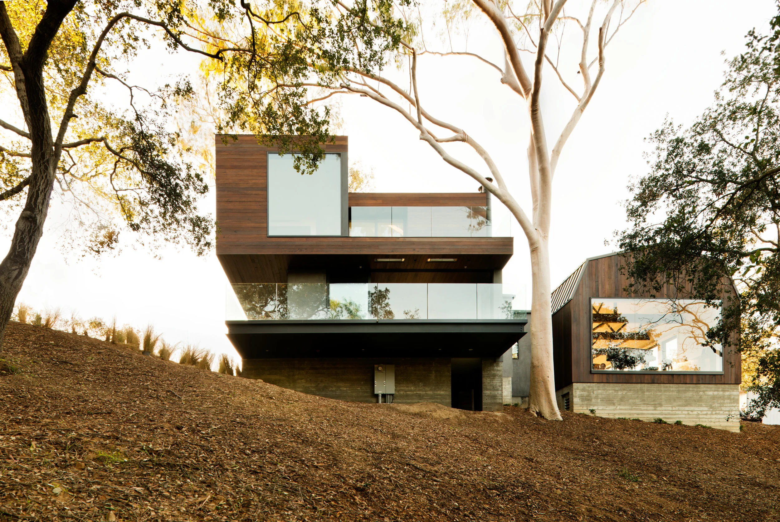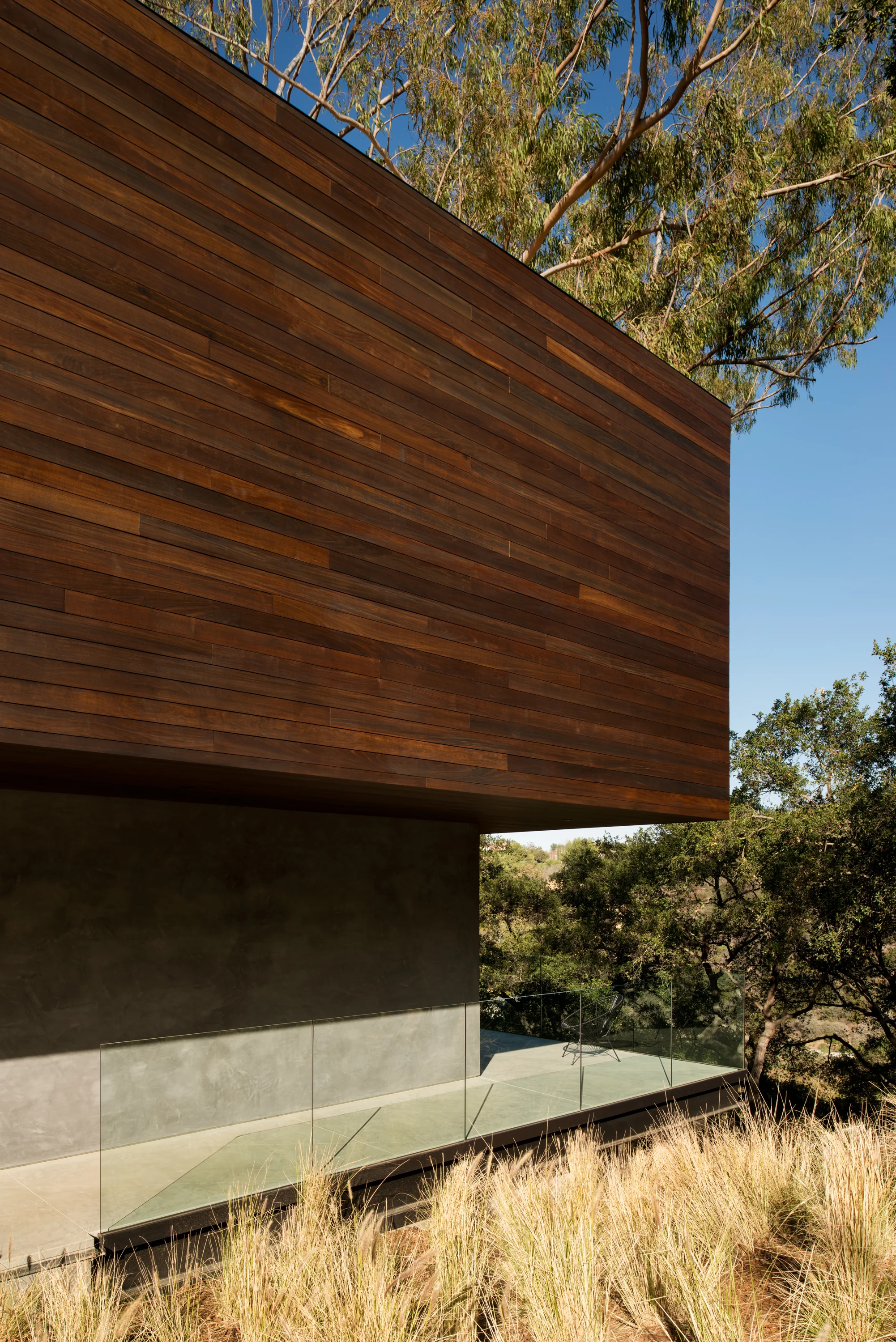 After careful planning and consideration of space, including incorporating a pre-existing structure, the barn, we came up with an impressive, stand alone, two-story, 2,650 sq. ft. structure with a deliberately conscious environmental footprint. This guest house sits independent from the main house, while nestled within the same one-hundred-twenty- coastal live oak trees. An existing barn was rehabbed extensively and functions as both a living room and a concert venue for up to eighty guests. Oak Pass guesthouse uses its height and a small footprint to maximize panoramic canyon views and strengthen its connection to the surrounding tree-filled site. The lower level consists of a rehabbed and enlarged barn, with constructed living spaces, which have their own taste and style of living. While Oak Pass main house celebrates the Earth in a vertical, upside-down layout, Oak Pass Guest House celebrates landscape. The exterior is clad in wood, with bedrooms at opposite corners of the floating volume. Just as Eucalyptus trees have their own canopies, the top story of the guest house is segmented, so the residents feel as though they are going from canopy view to canopy view. The upper floor of the guest house is clad in fire-resistant wood, which accentuates the natural environment that surrounds the property, and mimics the bark of the trees. The bedrooms at opposite corners of the floating volume ensure the inhabitants feel protected and sheltered while enjoying privacy.