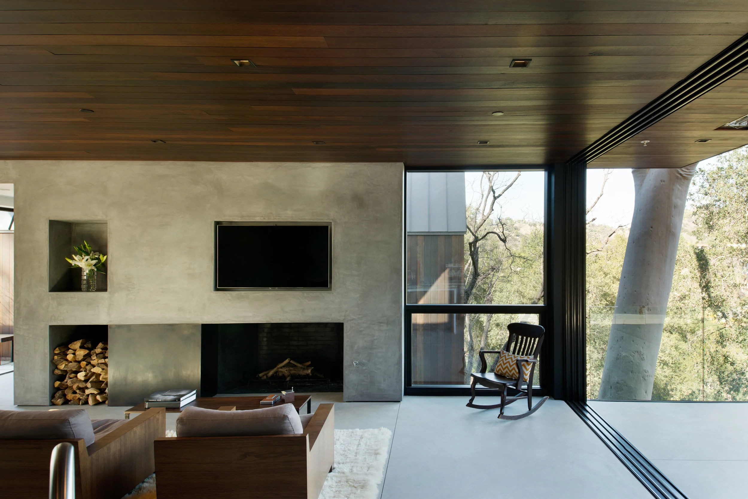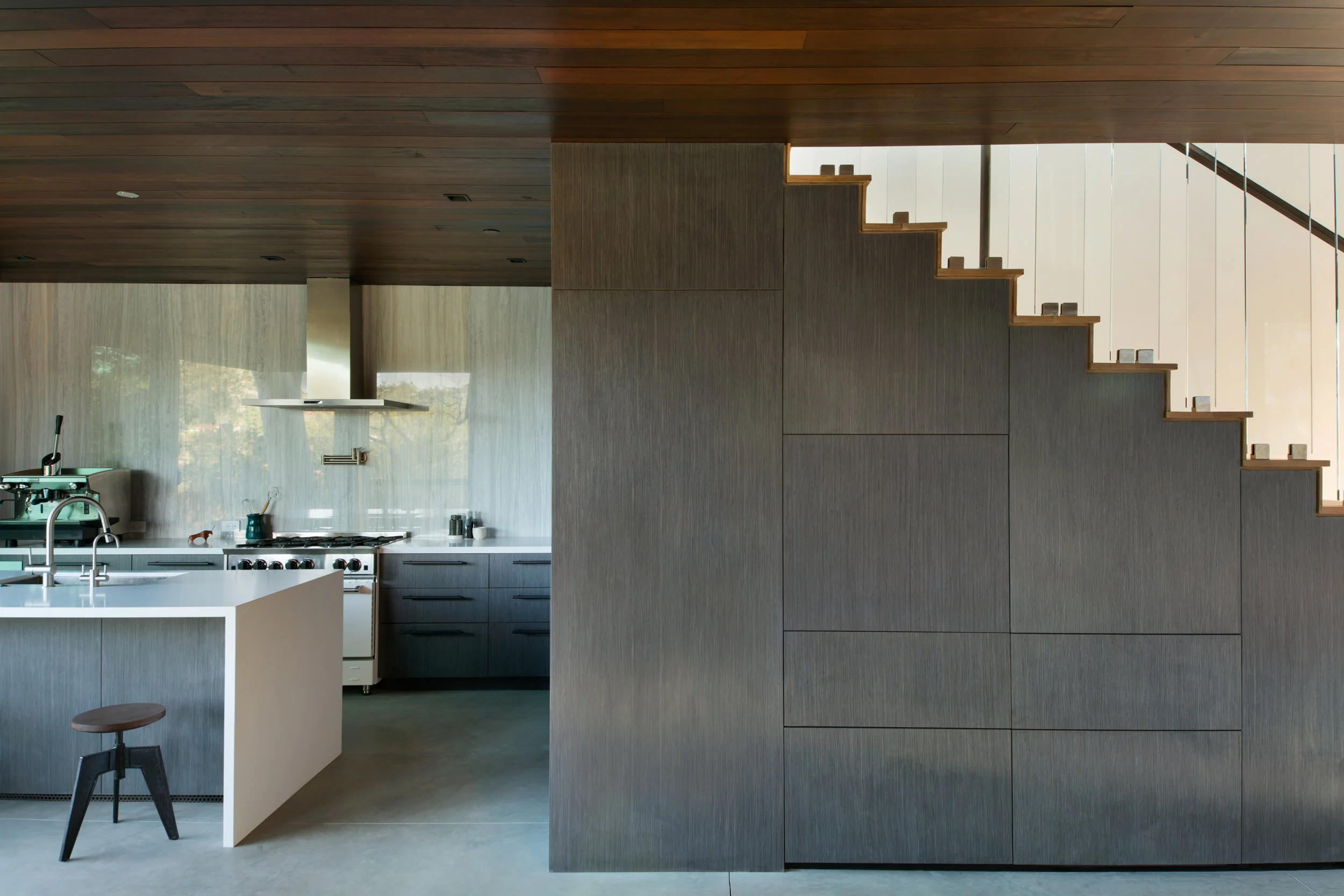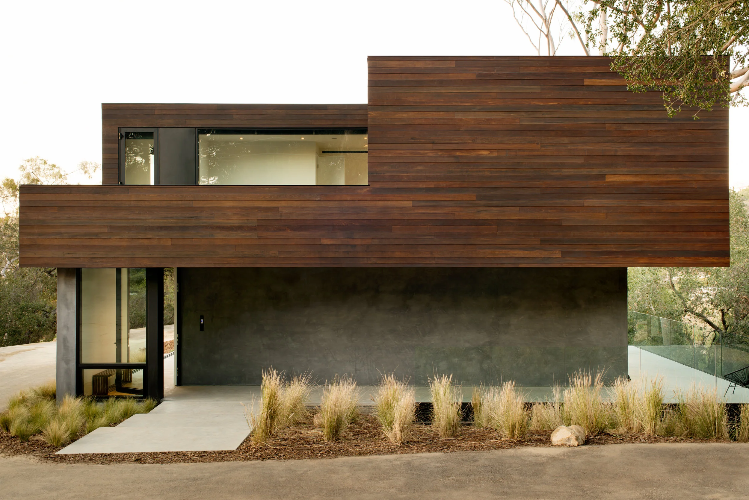 After careful planning and consideration of space, including incorporating a pre-existing structure, the barn, we came up with an impressive, stand alone, two-story, 2,650 sq. ft. structure with a deliberately conscious environmental footprint. This guest house sits independent from the main house, while nestled within the same one-hundred-twenty- coastal live oak trees. An existing barn was rehabbed extensively and functions as both a living room and a concert venue for up to eighty guests. Oak Pass guesthouse uses its height and a small footprint to maximize panoramic canyon views and strengthen its connection to the surrounding tree-filled site. The lower level consists of a rehabbed and enlarged barn, with constructed living spaces, which have their own taste and style of living. While Oak Pass main house celebrates the Earth in a vertical, upside-down layout, Oak Pass Guest House celebrates landscape. The exterior is clad in wood, with bedrooms at opposite corners of the floating volume. Just as Eucalyptus trees have their own canopies, the top story of the guest house is segmented, so the residents feel as though they are going from canopy view to canopy view. The upper floor of the guest house is clad in fire-resistant wood, which accentuates the natural environment that surrounds the property, and mimics the bark of the trees. The bedrooms at opposite corners of the floating volume ensure the inhabitants feel protected and sheltered while enjoying privacy.