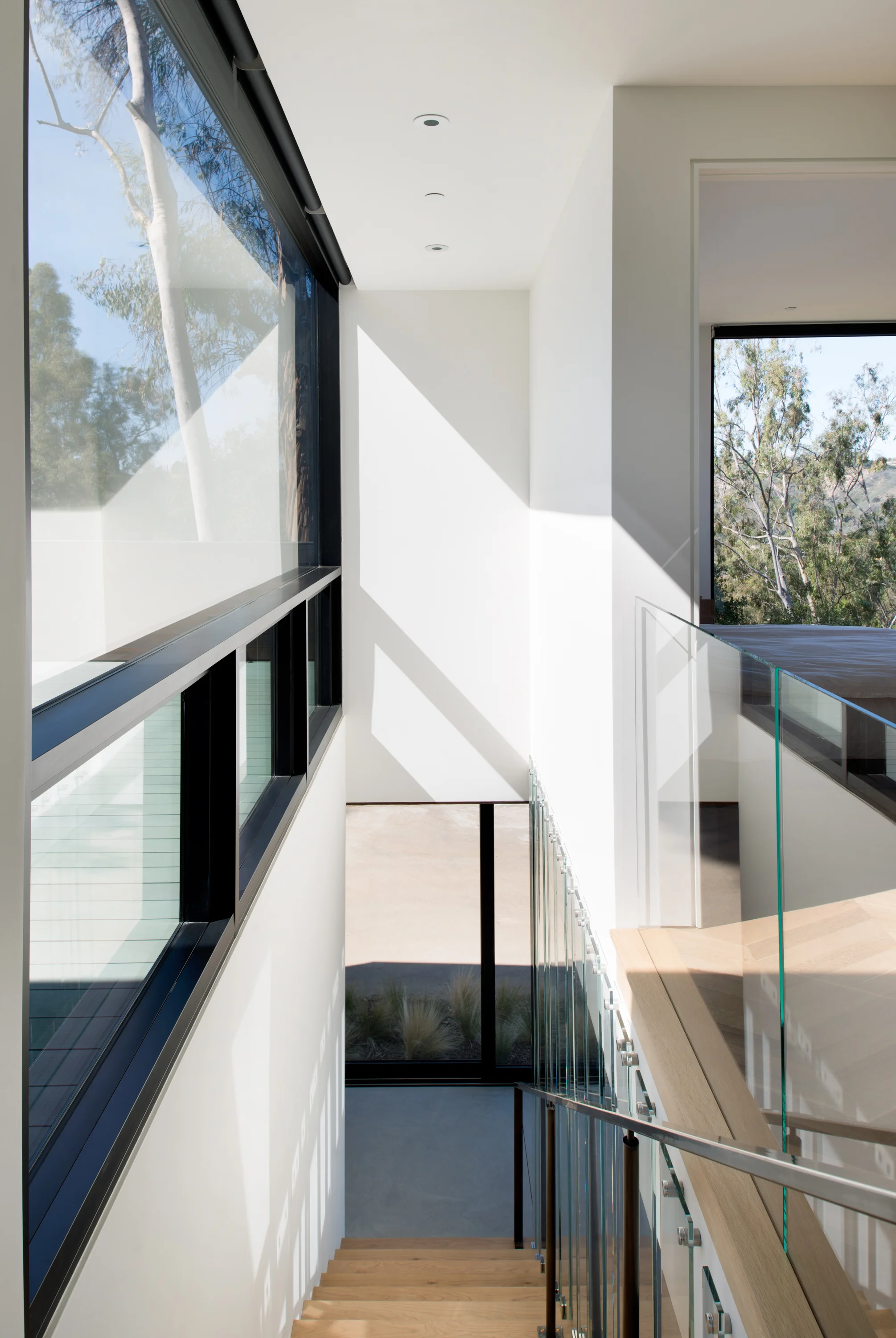 The upper floor of Oak Pass guest house is clad in a dark, warm, wood and has bedrooms at opposite corners of the floating second story level. This intentional conjoined living space was intended to double down on privacy within a compound. Not only does the main house achieve privacy from the guest house, but the guest house has moments of privacy within itself, further secluded from the main house, while still residing within the imagined boundaries of the compound. It was here in these moments of “in-between,” where the environment remained, and embraced the homes. It was in these moments of “in-between,” where the structures integrated seamlessly, instead of appearing to oppress the natural environment.