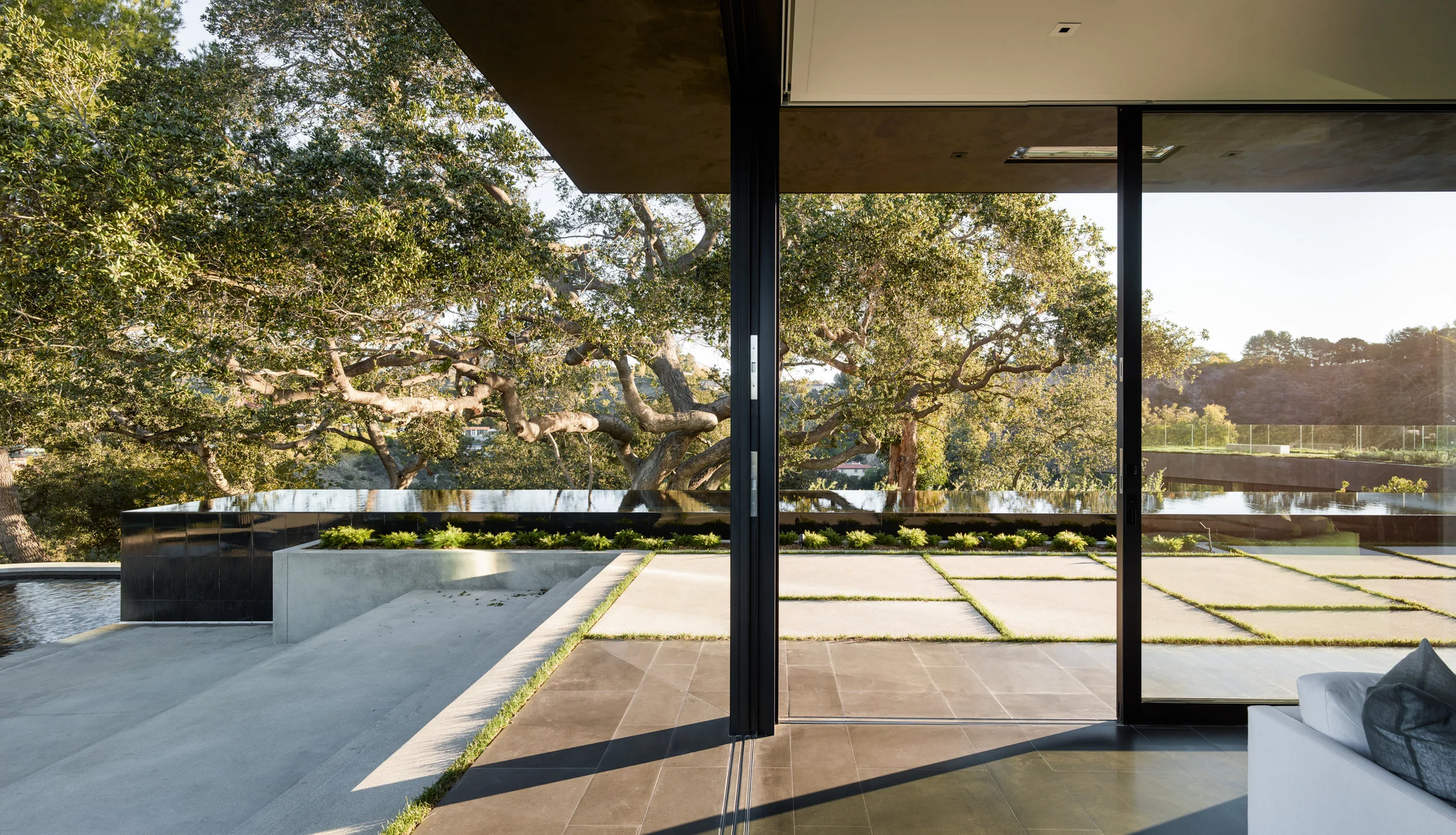 In summer, the walls of the lower level stay cool due to their being in direct contact with the soil of the earth, which is a plus in a desert landscape. The pool is one of the most romantic pools we’ve ever done, mainly because we allowed nature to set the tone, by intentionally designing the largest Coastal Oak on the property to hang over the seventy-five-foot black infinity lap pool with infinity edges on three of four sides. To be in the pool during day or night has an amplified feeling of being under the trees, the water's surface not only reflects the stars but the day-glow leaves of golden hour.