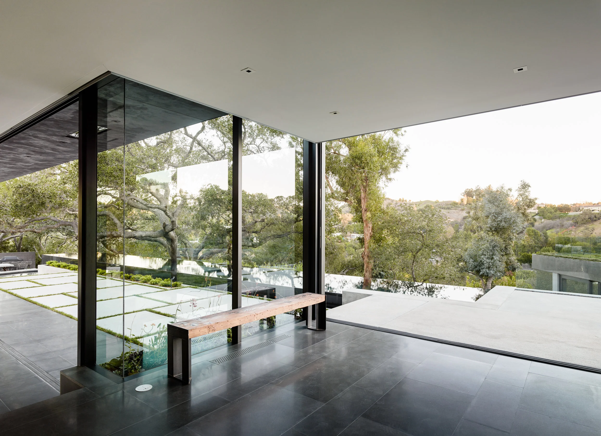 Ultimately, the respect with which we approached the grove's presence, allowed for the relatively large layout of the 8,000 sq. ft. home to belong versus appearing intrusive to the environment. Other equally attractive, almost primal aspects of the home incorporate innately human wants and needs, such as an indoor-outdoor terrace, which is accessed through the lower levels of the home, creating a private multifunctional living space by way of massive sliding pocket doors, which can be hidden away to maximize the open-air feeling of the house, while admiring the enormity of the sky, all while in the lower levels of the house. In this space, there is a communal fire pit, where inhabitants can feel sheltered, protected, and warm, within tall retaining walls framing the in-ground space.